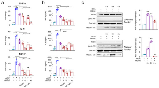 The mRNA expression of TNF-α, IL-6, and MIP-2 was significantly decreased by pre-treatment with inhibitors, NF-κB (MG132) and AP-1 (SR11302) (Figure 7a). Pre-treatment with MG132 resulted in a significant decrease in the protein levels of cytokines and chemokines (Figure 7b). SR11302 also caused a reduction in protein levels; however, this trend was not statistically significant (Figure 7c). NfEVs enhanced the phosphorylation of p65 both in the cytosol and nucleus. Phosphorylation of p65 was suppressed by treatment with MG132, suggesting that the NF-κB signaling pathway is the major pathway that induces proinflammatory immune responses in BV-2 microglial cells upon treatment with NfEVs (Figure 7c).