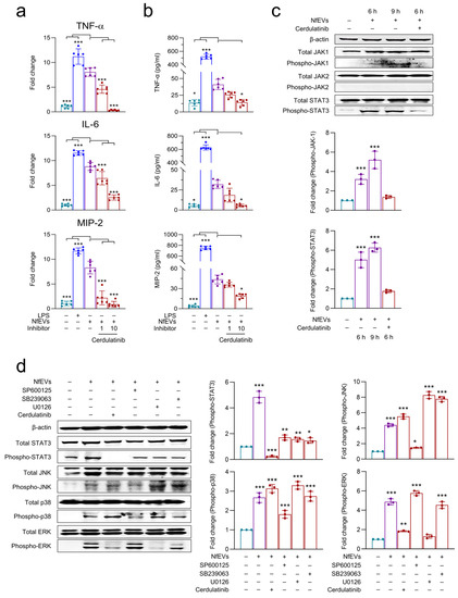 The mRNA and protein expression patterns of TNF-α, IL-6, and MIP-2 were analyzed to examine whether the JAK-STAT pathway could regulate proinflammatory responses in BV-2 microglial cells upon treatment with NfEVs. Pre-treatment with cerdulatinib (JAK-STAT inhibitor) inhibited the mRNA expressions of TNF-α, IL-6, and MIP-2 in a dose-dependent manner (Figure 8a). The inhibitor also gradually decreased their production at the protein level (Figure 8b). The phosphorylation status of JAK1, JAK2, and STAT3 was also analyzed. Immunoblot analysis showed that the phosphorylation levels of JAK1 and STAT3 increased in a time-dependent manner, whereas JAK2 phosphorylation was not detected (Figure 8c). The phosphorylation levels of JAK1 and STAT3 were significantly inhibited by pre-treatment with cerdulatinib, suggesting that JAK1-STAT3 is also involved in NfEVs-induced proinflammatory immune responses in BV-2 microglial cells (Figure 8c). To analyze the crosstalk between the MAPK and JAK-STAT signaling pathways in NfEVs-induced proinflammatory immune responses in BV-2 microglial cells, an additional immunoblot analysis was performed using the cells treated with each inhibitor. Each inhibitor blocked the phosphorylation of its corresponding target protein without affecting other proteins. Interestingly, ERK phosphorylation was suppressed by both cerdulatinib and U0126, suggesting that JAK-STAT activation may be associated with subsequent ERK pathway activation (Figure 8d).
