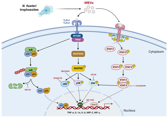 Summary of proinflammatory immune response in BV-2 microglial cells induced by NfEVs. NfEVs initially stimulate BV-2 microglial cells via the MyD88-dependent TLR-2/TLR-4 pathway. The NF-κB dependent MAPK pathways regulate the production of proinflammatory cytokines and chemokines in NfEVs-stimulated BV-2 microglial cells. Cerdulatinib, a JAK-STAT inhibitor, also downregulated phosphorylation of ERK, suggesting that the ERK is also affected by the JAK-STAT pathway. The image was created using BioRender (https://biorender.com/, accessed on 28 September 2022).