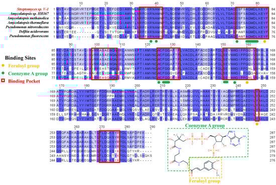 Sequence alignment of Ech/Hchl from different species. Binding sites for feruloyl moiety and CoA moiety are annotated using orange and green, respectively, and red boxes represent the binding pocket regions.