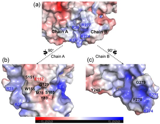 The electrostatic potentials were calculated using Adaptive Poisson-Boltzmann Solver (APBS) to visualize the electrostatic potential surface, which indicated that Chain A and Chain B of the Ech dimer together form a long and narrow cavity as the binding pocket (Figure 2a). The entrance of the binding pocket presented a higher positive potential distribution, with the basic amino acid residues on both sides (Chain A: K37, R38; Chain B: K274, R277), which is favorable for the binding of negatively charged CoA moiety. Meanwhile, to further understand the statistical potential distribution, the binding pockets of Chain A and Chain B were disassembled. It could be found that polar uncharged residues (Y83, S103, G129, S151 and W155) and M78 were distributed in the middle of the binding pocket of Chain A, which is fundamental for the binding of substrate FCA. Acidic amino acid residue E152 of Chain A is located in the catalytic center in the binding pocket, which was indispensable for the catalytic reaction. These results indicated that the binding pocket in Chain A constituted the major region for the whole binding pocket (Figure 2b). Compared with Chain A, the binding pocket of Chain B was composed of only several residues, such as the K274, R277 at and G279 near the entrance, and polar uncharged Y248 located innermost of the pocket, which was believed to stabilize the terminal of substrate FCA (Figure 2c).