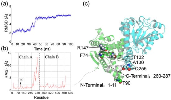 Subsequently, a 100 ns molecular dynamics (MD) simulation was performed towards the Ech-FCA complex in three independent replicas to identify the residues with unstable effects on the Ech-FCA complex. Due to the irregular structure of residues 1–14 at the N-terminus, residues 1–14 were removed at the beginning of the simulation to ensure the acceptable and validity of the initial model. RMSD and RMSF during MD simulation were shown in Figure 4a,b. It could be read from the first 50 ns stage, that the RMSD indicated a relatively stable condition, while in the next 50 ns the average RMSD was 5.64 Å which indicated some unstable factors in the wild-type (WT) of Ech. The RMSF result also verified this proposition. The RMSF indicated the most significant fluctuation region located in the 232–287 from N terminal (Chain A), which sited at the junctions of the polymer. However, residues 519–574 (232–287 in Chain B) indicated relatively smaller fluctuations. It could be speculated that the residues 232–287 in Chain B established tight interactions with Chain A and substrate FCA. Also, a relatively large RMSF was found near T90. Hence, two deletion mutants (ΔT90 and ΔTGPEIL) were designed. ΔT90 means that the T90 residue was deleted, and ΔTGPEIL means that the residues 91–95 were replaced by GPEIL besides the T90 deletion. Additionally, to decrease the influence of residues from both N and C terminals, two truncated mutants were designed as ΔN1-11 and ΔC260-287. All these designed mutants and their descriptions are listed in Table 1, and their position in protein can be found in Figure 4c.