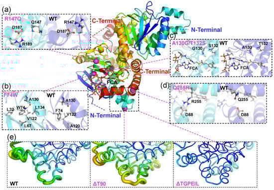 Structural features and location of Ech mutations. The Ech dimer is shown as a cartoon, while the Cα atoms of the mutations are shown as purple spheres. Structural effects of R147Q (a), F74W (b), A130G/T132S (c) and Q255R (d) mutants (cyan) compared to WT (blue) in MD simulations. Key residues and FCA are shown in ball and stick representations. (e) The conformational flexibility of WT and ΔT90 and ΔTGPEIL mutants is displayed using predicted B-factors in MD simulations.