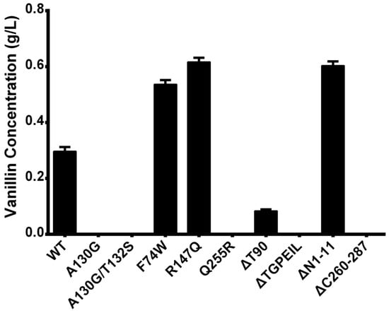 Wild-type Ech and all mutants were constructed and introduced into the pET-Duet-1 expression vectors, and the ferulic acid was supplemented as substrate. After 24 h of biotransformation, the resulting vanillin was tested by GC and the productivity was plotted in Figure 6.