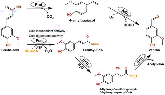 CoA-independent pathway and CoA-dependent pathway for biosynthesis of vanillin from ferulic acid.