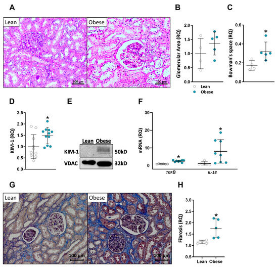 Kidney pathology of lean vs. obese individuals. (A) Representative images of ×20 magnified H&E-stained kidneys. Quantification of glomerular area (B) and Bowman’s space area (C). Kidney injury marker-1 (KIM-1) was measured via Western blot and quantified (D,E). TGFB and IL-18 relative kidney mRNA expression (F). Representative images of ×20 magnified Trichrome-stained kidney sections (G) and fibrosis quantification (H). Data are mean ± SD; * p < 0.05 obese vs. lean group.