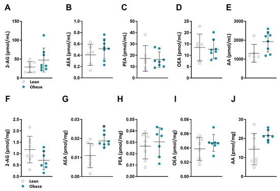 Serum and kidney eCB levels in lean vs. obese patients. 2-AG (A), AEA (B), PEA (C), OEA (D), and AA (E) levels were extracted from serum, and 2-AG (F), AEA (G), PEA (H), OEA (I), and AA (J) levels were extracted from kidney tissue. All eCBs were measured using LC-MS/MS. Data are mean ± SD; * p < 0.05 vs. lean group.