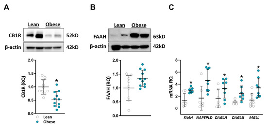 Kidney CB1R and ECS enzyme expression levels. Kidney proteins were extracted; CB1R (A) and FAAH (B) levels were examined via Western blot and quantified. Relative mRNA expression of FAAH, NAPEPLD, DAGLA, DAGLB, and MGLL genes (C). Data are mean ± SD; * p < 0.05 vs. lean group.