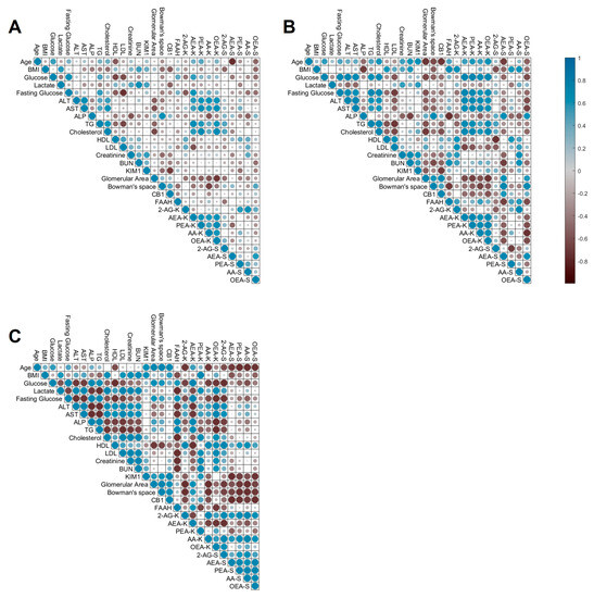 Large-scale correlation analysis. This correlation matrix displays the Pearson correlation coefficients between multiple variables. The matrix was applied to variables of all patients (A) and then stratified according to their BMI, analyzing the lean (B) and obese (C) groups separately. In eCBs measurements, K = kidney, and S = serum.