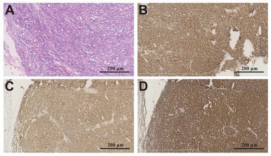 The hematoxylin-eosin (HE) staining of the GIST tumor tissue was consistent with typical GIST pathology. The cells were spindle-shaped and arranged in bundles, while the mitotic count per 50 high-power fields (HPFs) was approximately 1. Immunohistochemical results showed that: DOG-1 (+); Ki-67 (3% +); CD34 (+); CD117 (+); Desmin (−); S-100 (−); SMA (−); SDHB (+); and pan-TRK (−) (Figure 1).