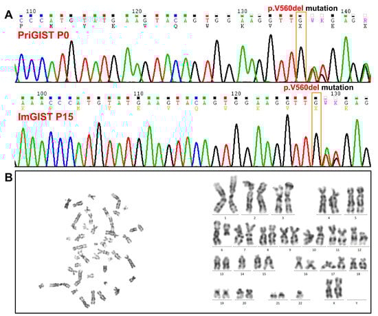 To the best of our knowledge, this is the first report of the successful establishment of a high-purity immortalized human GIST cell line (ImGIST), by transfecting primary GIST cells derived from a Chinese patient with SV40LT. In this study, ImGISTs were characterized using biomarkers, cytogenetics, and cytotoxicity experiments to describe their morphology, biological characteristics, genetic features, and comparative analyses with primary GIST cells. The culture condition for ImGISTs was optimized during cell culture to maximize the population doubling. The ImGIST cells had a significantly higher proliferation index and proliferation rate than the primary GIST cells. The ImGIST cells had a stable growth cycle, were passaged for more than 35 generations, and maintained a vigorous proliferation capacity. This cell line had the same genetic characteristics and immunophenotypes as the primary GIST cells. Approximately 85% of the GISTs have C-KIT or PDGFRα oncogenic mutations that constitutively activate downstream PI3K/AKT/mTOR and RAS/RAF/MEK pathways, which lead to cell proliferation and survival. C-KIT mutations are present in approximately 70–80% of the GISTs, with the most common mutation sites being in exons 11 (65–80%) and 9 (6–10%), followed by exons 13 (1–2%), 17 (<1%), and 8 (<1%) [,]. The benefit of recurrence-free survival after imatinib treatment depends on the location of the mutation in patients with GISTs, with those involving C-KIT 11 appearing to have the greatest benefit [,]. We detected an identical C-KIT 11 V560del mutation in ImGIST and primary cells, and follow-up drug sensitivity assays confirmed that the ImGIST cells were sensitive to imatinib. GISTs can acquire chromosomal aberrations, including deletions in chromosomes 14q, 22q, 1p, and 15q []. Typical deletions in chromosomes 14 and 22 were detected in ImGIST cells.