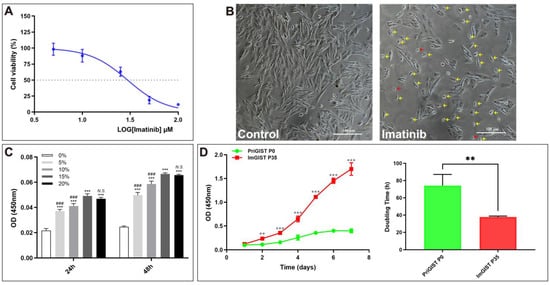 Biological characteristics of ImGIST cells. (A) Imatinib treatment inhibited ImGIST cell growth (B) After treatment with imatinib, most ImGIST cells had a small spindle-shaped morphology and lost their fusion growth ability (yellow arrow), while a few cells died (red arrow, 100×). (C) The optimal fetal bovine serum concentration for the maintenance culture of ImGIST cells was 15%. *** p < 0.001, vs. 0% group; ### p < 0.001, vs. 15% group; N.S., no significant difference, vs. 15% group. (D) The cell growth curves were determined using the CCK-8 assay between ImGIST and PriGIST cells. The mean Td values for ImGIST and PriGIST cells were 37.8 and 74.1 h, respectively. ** p < 0.01, vs. PriGIST P0 group; *** p < 0.001, vs. PriGIST P0 group. IC50: half maximal inhibitory concentration; Td: cell population doubling time.