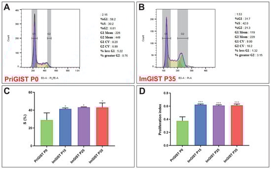 Cell cycle of PriGIST cells and ImGIST cells. Cycle distribution of (A) PriGIST and (B) ImGIST cells. (C) The percentage of PriGIST and ImGIST cells in S phase of the cell cycle. (D) The proliferation indices of ImGIST (P35) and PriGIST cells. All data are presented as means ± SD. *** p < 0.001, vs. PriGIST P0 group; * p < 0.05, vs. PriGIST P0 group.