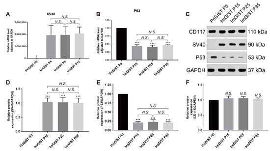Expression of SV40, P53, CD117, and GAPDH in PriGIST and ImGIST cells was measured by real-time PCR and western blotting. (A,B) Real-time PCR was used to detect the mRNA levels of SV40 and P53 in PriGIST and ImGIST cells normalized to GAPDH (n = 4). (C) Representative image of a western blot showing bands for SV40, P53, CD117, and GAPDH. (D–F) Relative optical density was normalized to that of GAPDH (n = 4). All data are presented as means ± SD. *** p < 0.001, vs. PriGIST P0 group; N.S., no significant difference when compared to PriGIST P0 in panel F. SV40: Simian virus 40; P: passage.