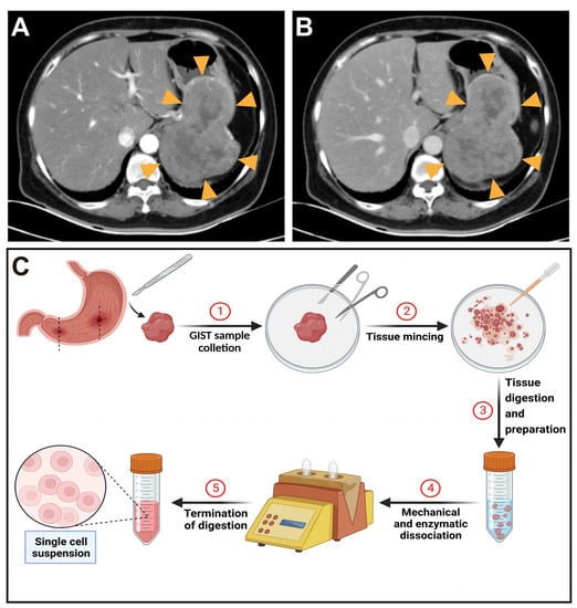 Clinical imaging information of the patient and the isolation of primary GIST cells. Abdominal computed tomography images of the patient in the (A) arterial phase and (B) venous phase. The lesion site is indicated by yellow triangles. (C) Digestion and isolation process of primary GIST cells.