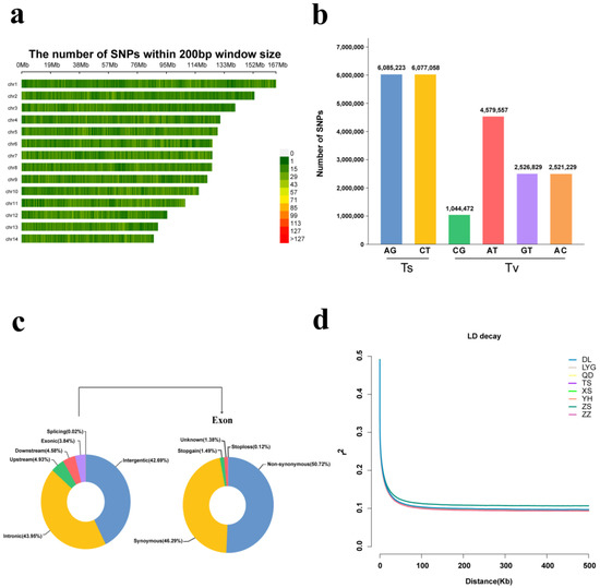 Variation information statistics and LD pattern. (a) Distribution of SNPs on 14 chromosomes in hard-shell mussels. Density results are displayed using the number of SNPs per 200 bp in the data expressed as a color index. (b) Transition and transversion of SNPs in the genome. (c) Location and number of SNPs in the gene structure. Number and proportion of SNPs probed in intergenomic regions and in the coding and non-coding sequences. In which SNP annotations in exons include synonymous and non-synonymous substitutions and their function is classified. (d) LD attenuation curves for eight sampling sites along the Chinese coast.