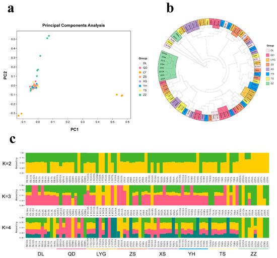 We analyzed the genetic relationships and differences among populations using 2,883,362 LD-filtered SNPs. The results of the principal component analysis (PCA) showed that individuals from each group were closely clustered together, but they were not clearly separated from other populations. Only a few samples from the ZZ region and the LYG region showed significant deviation from other district groups, indicating a high degree of homogeneity among M. coruscus populations (Figure 2a). The NJ tree also revealed a scattered clustering pattern among samples that did not follow the characteristics of samples or geographical distribution, consistent with the results of the PCA analysis (Figure 2b).