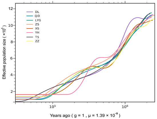 Two strategies were used to extrapolate the historical demography. First, Tajima’s D [101] was calculated using VCFtools software for the neutrality test. This test was used to detect any deviations from the neutrality assumption, which would indicate recent population expansion or contraction. Secondly, we randomly selected four samples for each of the M. coruscus populations, resulting in a total of 32 samples. The SMC++ model v1.15.4 (https://github.com/popgenmethods/smcpp (accessed on 11 July 2022)) [102] was then used to estimate the historical effective population size for each of the selected populations separately. As there were no mutation rates available for M. coruscus or closely related species, we used a mutation transformation matrix based on oyster data [103]. A generation time of 1 year and a neutral mutation rate of µ = 1.39 × 10−9 were used [103,104]. The parameters were set to -c 10 -k 10 -m 1.39 × 10−9 -sp cubic.