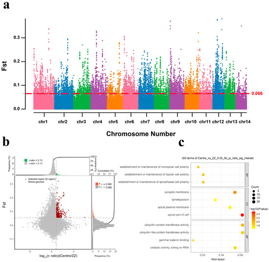 Candidate gene exploration and GO enrichment analysis of hard-shell mussels from the Zhangzhou Region (Centre_vs_ZZ). (a) Distribution of FST values on 14 chromosomes in the northern and Zhangzhou groups. The red dashed line indicates the significant threshold for identifying putative selection regions (top% 5 FST = 0.066, p-value < 0.05). (b) The central group is the control group and the Zhangzhou group is the selection group; 433 selection genes were screened. The red dots show the selective scan. (c) Results of GO enrichment analysis of the selected genes in Zhangzhou.
