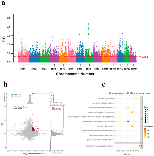 Candidate gene exploration and GO enrichment analysis of hard-shell mussels from the Zhangzhou Region (Northern_vs_ZZ). (a) Distribution of FST values on 14 chromosomes in the northern and Zhangzhou groups. The red dashed line indicates the significant threshold for identifying putative selection regions (top% 5 FST = 0.062, p-value < 0.05). (b) The northern group is the control group and the Zhangzhou group is the selection group; 433 selection genes were screened. The red dots show the selective scan. (c) Results of GO enrichment analysis of selected genes in Zhangzhou.