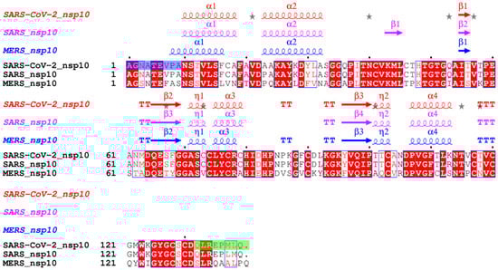 Protein sequence and structural alignment of full-length nsp10 proteins from SARS-CoV-2, SARS and MERS. Identical residues are shown in white on a red background, similar residues are shaded in red and distinct residues are displayed in black. Truncated residues of the long SARS-CoV-2 nsp10 construct are highlighted in green, and additional missing residues of the short SARS-CoV-2 nsp10 construct are highlighted in blue. The percent identity between SARS-CoV-2 and SARS nsp10 proteins is 97.1%. In contrast, the percent identity between SARS-CoV-2 and MERS nsp10 proteins is 59.4%. The alignment was carried out using CLUSTAL OMEGA, 1.2.4 [34] while the secondary structure was assigned by DSSP as implemented in ESPript 3.0 [35].