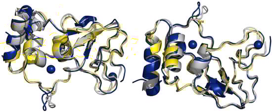 Overlay of crystal structures of nsp10 from MERS, SARS, and SARS-CoV-2. Ribbon diagram of crystal structures of nsp10 MERS (grey, PDB entry 5YN5), SARS (yellow, PDB entry 2G9T), and SARS-CoV-2 (blue, PDB entry 7DIY) with structural zinc atoms shown as blue spheres. View on right is rotated by 180° along the horizontal axis with respect to view on the left. The three nsp10 crystal structures downloaded from the RCSB PDB were superposed in Pymol (v2.4.1) [36].