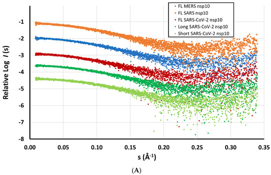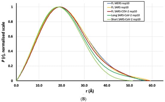 The Radius of Gyration (Rg) was consistent for all full-length nsp10s at approximately 17.2–17.3 Å, slightly smaller for the shorter SARS-CoV-2 nsp10 constructs. Similar values were calculated for the maximum distance (Dmax), ranging from 51 to 59 Å, as well as for the estimated molecular masses. All statistics are summarised in Table S2. Overall, SAXS revealed a similar shape of a globular domain for all full-length and shorter nsp10s (Figure 4). The distance distribution layout of the two shorter nsp10 proteins of SARS-CoV-2 closely resembled a Gaussian layout, suggesting a more spherical shape (Figure 4B). Kratky plots suggested a rigid and identical shape for all measured samples (Figure S5).