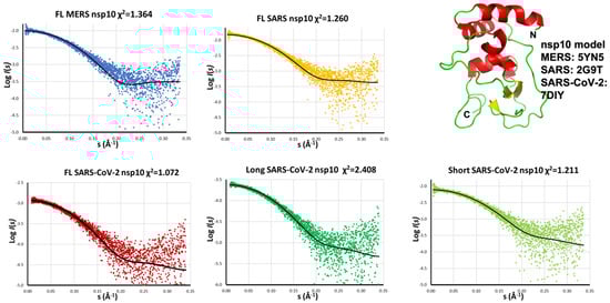 Comparison between the measured scattering data and the calculated scattering curve from the model (in black and in cartoon representation on the right). Discrepancy χ2 is shown on the header of each plot. The nsp10 coordinates were extracted from the PDB.