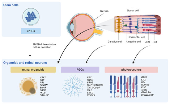 Although retinal organoids contain both RGCs and photoreceptors, more precise markers for their identification will be described in the following section.