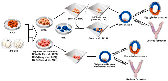 Blastoid formation from mouse expanded potential stem cells (EPSCs) and totipotent-like stem cells. The resulting blastoids displayed the developmental potential to form egg cylinder-like structures through an in vitro culture system and the capacity to induce implantation and decidualization in vivo. EPSCs: expanded potential stem cells; ESCs: embryonic stem cells; TSCs: trophoblast stem cells; TPS cells: totipotent potential stem cells; TLSCs: totipotent-like stem cells; TBLCs: totipotent blastomere-like cells [18,19,20,128,129,130].