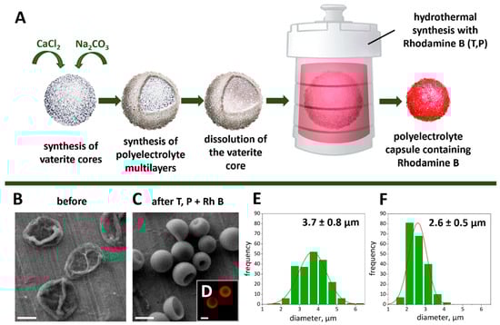 Scheme of Rhodamine B encapsulation in polyelectrolyte microcapsules (A). Typical SEM images of microcapsules before (B) and after (C) the hydrothermal synthesis. CLSM image of typical thermal treated polyelectrolyte microcapsules with Rhodamine B (D). Size distribution with Gaussian fit of microcapsules before (E) and after (F) hydrothermal synthesis in an aqueous solution. The diameter was determined from the SEM images of 200 microcapsules. The scale bar is 2 µm.