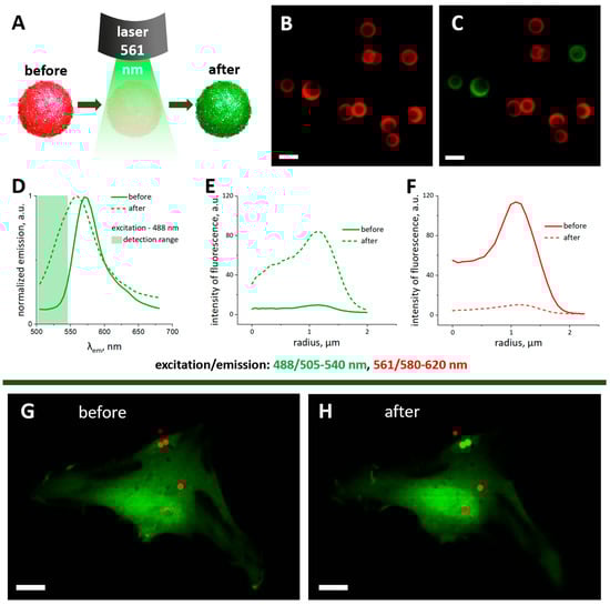 A continuous diode laser with a power of 50 mW and wavelength of 561 nm was used to obtain successful capsule photoconversion (Figure 2A). A photoconversion scanning area of 12.11 × 12.11 μm was chosen to maximize laser irradiation for other microcapsules and exclude their accidental photoconversion. Thermally treated polyelectrolyte microcapsules demonstrated bright fluorescence in the emission range of 580–620 nm (Figure 2B, red color) before photoconversion using 561 nm laser irradiation. After photoconversion, a bright fluorescence signal appeared in the range of 505–540 nm (Figure 2C, green color). The emission spectra (so-called lambda-scans) obtained before and after the 561 nm photoconversion procedure at an excitation wavelength of 488 nm demonstrated a hypsochromic shift of the emission spectrum maximum (Figure 2D) and an increase of fluorescence signal in the detection range of 505–540 nm (Figure 2D, light green rectangle). Spectral changes were confirmed by analyzing the capsule’s average fluorescence intensities before and after 561 nm irradiation. Fluorescence intensity increased in the 505–540 nm emission range (Figure 2E) and decreased in the 560–650 nm emission range (Figure 2F).