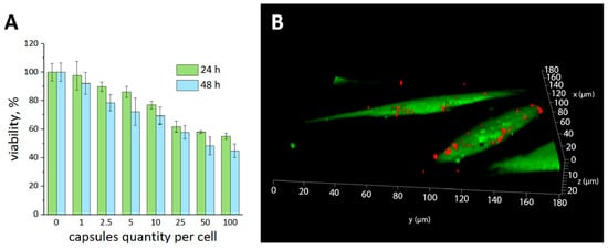 Viability dependence of hMSCs on the number of added thermally treated polyelectrolyte microcapsules (A). 3D reconstruction of hMSCs 24 h after incubation with microcapsules (microcapsules (red), cytoplasm stained with vital dye—Calcein AM (green)) (B).