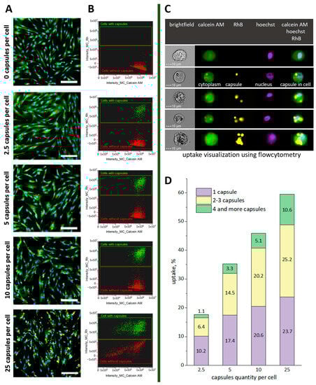 Fluorescence images of hMSCs 24 h after incubation with different concentrations of microcapsules (cytoplasm stained with the vital dye—Calcein AM (green), cell nucleus—Hoechst 33258 (blue), and microcapsules—Rhodamine B (red)). The scale bar is 200 µm (A). Cytograms of Calcein AM and RhB fluorescence intensity visualizing the subpopulations of cells (Calcein AM) associated with fluorescence specific for capsules (RhB) depending on the concentration of the added capsules (B). Optical and fluorescent images of hMSCs were obtained using a flow cytometer with an object imaging system (C). Dependence of the percentage of cells in the population that internalized the capsules on the concentration of the added capsules (D).