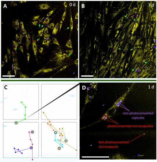 CLSM images of hMSCs with microcapsules at 0 (A) and 7 (B) days after labeling (hMSCs—yellow (dye—Cy7), non-photoconverted microcapsules—blue, photoconverted—red). Green arrows indicate the photoconverted microcapsules. The scale bar is 100 µm. (C) Tracking diagram of six cells over 4 days. The dots circled in black indicate day 0. The remaining dots show the position of the nucleus of the labeled cell every 24 h. The side of each square is 500 μm. Tracks of individual cell movement are marked with different colors. (D) Image of one of the marked cells 1 day after the tracking commenced. The scale bar is 50 µm.