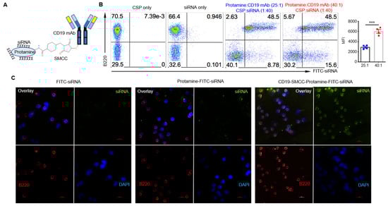 Properties of the CSP-specific siRNA carrier system: (A) The graphical depiction of anti-CD19 mAb coupling to protamine by bivalent cross-linker sulfo-SMCC siRNA conjugate via electrostatic interactions. (B) Flow cytometric analysis showed the affinity of the CSP-FITC-labeled siRNA conjugate to B cells. Representative dot plots and summarized MFI data are shown. MFI: mean fluorescent intensity. Pseudocolor plots are a type of bivariate density plot. It displays the relative population density of cell populations within the Graph Window along two parameters. Data are shown as the mean ± SEM (n = 3). *** p < 0.001, Student’s t-test. Red dots are from protamine:CD19 mAb at 40:1 ratio while blue dots are at 25:1 ratio. (C) Confocal laser scanning microscopy images of the FITC-siRNA (green), protamine FITC-siRNA, and CSP FITC-siRNA conjugate staining in B cells (B220, red). DAPI staining (blue) was used to reveal nuclei. Scale bars: 20 μm.