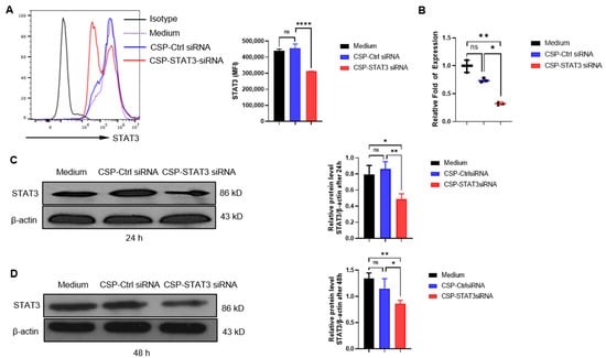 CSP-STAT3 siRNA conjugate suppresses STAT3 expression in A20 cells: (A) A20 cells (1 × 106) were incubated with RPMI 1640 medium (Medium), 60 nM CSP-control siRNA conjugate (CSP-Ctrl siRNA), or 60 nM CSP-STAT3 siRNA conjugate (CSP-STAT3 siRNA) for 24 h at 37 °C. Flow cytometric analysis was performed for STAT3 expression (MFI, mean fluorescent intensity; n = 3 for each group). Shown here is one representative of three independent experiments. **** p < 0.0001, one-way ANOVA. (B) A20 cells treated as above were collected and total RNA was isolated for qRT-PCR. Data are shown as the mean ± SEM (n = 3). * p < 0.05; ** p < 0.01; one-way ANOVA. (C,D) After 24 h (C) and 48 h (D) treatment, A20 cells were lysed and proteins were extracted for Western blot and quantification analysis of relative STAT3 (n = 3/group). Shown here is one representative of three independent experiments. ns, not significant; * p < 0.05; ** p < 0.01; one-way ANOVA.