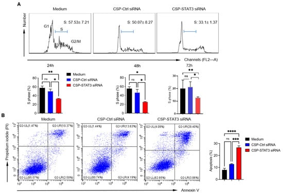 CSP-STAT3 siRNA conjugate inhibits A20 lymphoma cell cycle and induces apoptosis of A20 cells: (A) A20 cells (1 × 106) were incubated with RPMI 1640 medium (Medium), 60 nM CSP-control siRNA conjugate (CSP-Ctrl siRNA), or 60 nM CSP-STAT3 siRNA conjugate (CSP-STAT3 siRNA) for 24 h at 37 °C. Flow cytometric analysis was performed for cell cycle analysis. Representative flow plots and summarized data are shown as the mean ± SEM (n = 3). (B) A20 cells (1 × 106) were incubated with RPMI 1640 medium, 60 nM CSP-control siRNA conjugate, or 60 nM CSP-STAT3 siRNA conjugate for 24 h at 37 °C. Apoptosis assay was performed and analyzed using flow cytometry. Representative flow plots and summarized data are shown (n = 3). ns, not significant; * p < 0.05; ** p < 0.01; *** p < 0.001; **** p < 0.0001, one-way ANOVA.