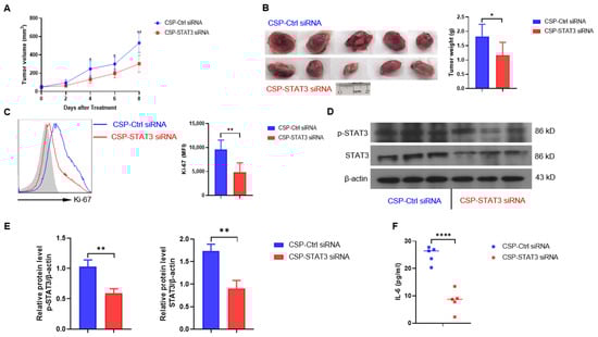 Next, we analyzed the effect of CSP-STAT3 siRNA conjugate in vivo. To test the therapeutic effect of the CSP-STAT3 siRNA conjugate treatment, A20 cells were subcutaneously injected into NOD SCID (NSG) mice, and mice with palpable tumors were randomized into two groups. Tumor-bearing mice were treated every two days by an in vivo injection of either CSP-STAT3 siRNA conjugate or CSP-control siRNA conjugate, and tumor growth was monitored. The CSP-STAT3 siRNA conjugate significantly inhibited tumor growth compared with the CSP-control siRNA conjugate (Figure 4A). This was also revealed by analyzing tumor weight (Figure 4B). Further experiments were performed to analyze Ki-67 as a proliferation marker in the tumors from mice treated in vivo. In the CSP-STAT3 siRNA conjugate tumors, Ki-67 was significantly reduced as compared to those from the CSP-control siRNA-conjugate-treated mice (Figure 4C). We also detected STAT3 expression by carrying out a Western blot analysis on the tumors after CSP-STAT3 siRNA conjugate or CSP-control siRNA conjugate treatment. In the A20 tumors treated with CSP-STAT3 siRNA conjugate, both the p-STAT3 and STAT3 levels were suppressed compared to those treated with CSP-control siRNA conjugates (Figure 4D,E). In addition, we found that the serum IL-6 level was also significantly reduced in mice treated with CSP-STAT3 siRNA conjugates (Figure 4F). Taken together, these findings suggest that specifically targeting STAT3 siRNA to B cell lymphoma cells can significantly reduce tumor burden and progression.