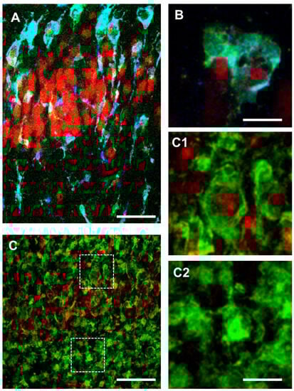 Representation of the different stages of microglia activation, in CA1 of organotypic hippocampal slices 24 h (A,B) and 36 h (C–C2) after OGD. Anti IBA1 antibody (green), anti MHC II antibody (blue), anti NeuN antibody (red). Colocalization of IBA1 (green) and MHC II (blue) is evidenced by the cyan colour (A,B). Scale bars: 25 µm (A); 10 µm (B,C1,C2); 50 µm (C) (modified from [48]).