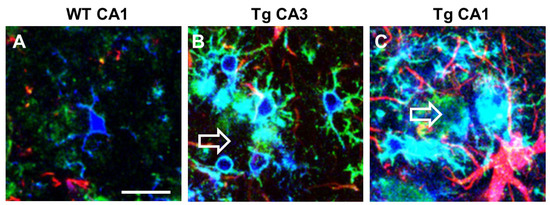 Microglia express α7nAChR [198] that possibly drive the “cholinergic anti-inflammatory pathway” that regulates systemic inflammatory responses [199]. In CA1 and CA3 of TGCRND8 mice, a transgenic model of AD, microglia surrounding Aβ plaques (plaque activated microglia, PAM) have a different phenotype and show differential expression of α7nAChR (Figure 3). In TGCRND8 mice, microglia in CA1 are bigger, more reactive, and express higher levels of α7nAChR than in WT mice and in CA3 of Tg mice (Figure 3). In CA3, microglia show a ramified state and express α7nAChR (Figure 3B), while in CA1 microglia have a round cell body with shorter branching, and the expression of α7nAChR is more intense (Figure 3C). This differential response of microglia in CA1 and CA3 around plaques confirms one more time the differential spatial states of the cells. Hart and colleagues [200] showed a further regional difference between microglia located in the white matter versus microglia located in the grey matter [184]. Region-specific variations in gene expression (both increases and decreases) may be implicated in the progression or in the resolution of neurodegenerative diseases [201].