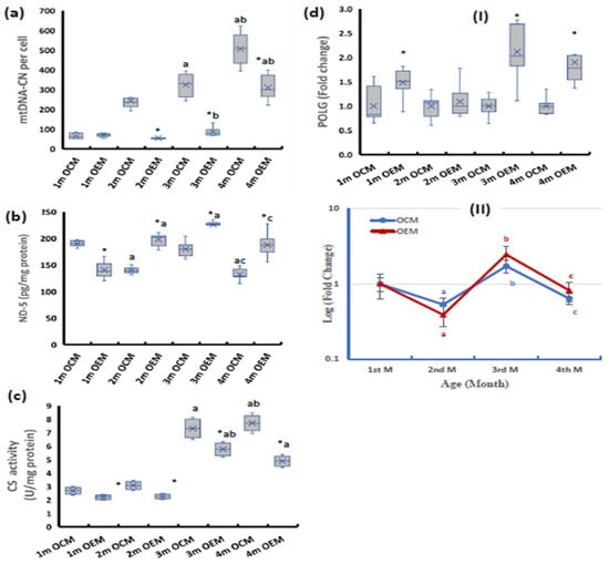 Ovarian levels of (a) mitochondrial DNA copy number (mtDNA-CN) per cell, (b) NADH dehydrogenase subunit-5 (ND-5) contents, (c) citrate synthase (CS) activity, (d) polymerase gamma (POLG) expression at (I) mRNA level. (II) Age-dependent change in mRNA expression relative to the 1st month. OCM: offspring of control mothers, OEM: offspring of SOF-exposed mothers, m: month. n = 8 in each subgroup, data presented as median (IQR). *: OEM significantly differs from OCM by Mann–Whitney test (p ≤ 0.05). a: significantly different from 1st month by Kruskal–Wallis test (p ≤ 0.05). b: significantly different from 2nd month by Kruskal–Wallis test (p ≤ 0.05). c: significantly different from 3rd month by Kruskal–Wallis test (p ≤ 0.05).