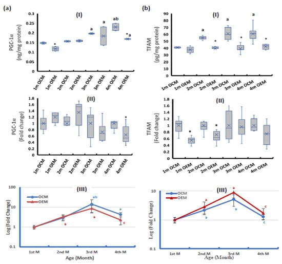 Ovarian expression of (a) peroxisome proliferator-activated receptor gamma coactivator-1alpha (PGC-1α) and (b) mitochondrial transcription factor A (TFAM) at (I) protein level and (II) mRNA level. (III) Age-dependent change in mRNA expression relative to the 1st month. OCM: offspring of control mothers, OEM: offspring of SOF-exposed mothers, m: month. n = 8 in each subgroup, data presented as median (IQR). *: OEM significantly differs from OCM by Mann-Whitney test (p ≤ 0.05). a: significantly different from 1st month by Kruskal–Wallis test (p ≤ 0.05). b: significantly different from 2nd month by Kruskal–Wallis test (p ≤ 0.05). c: significantly different from 3rd month by Kruskal–Wallis test (p ≤ 0.05).