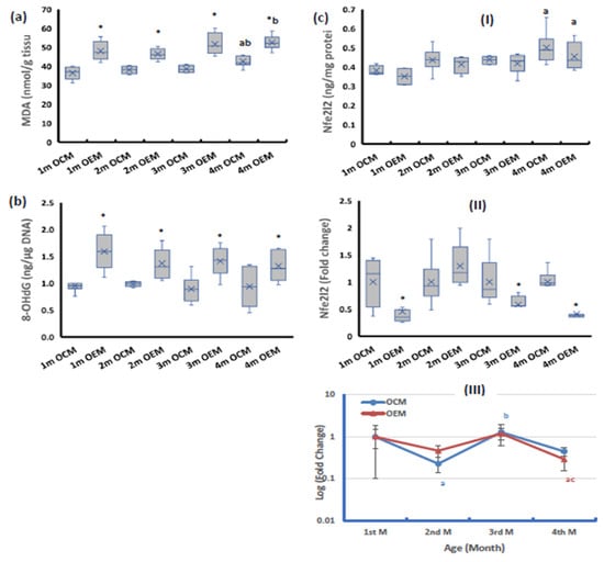 Ovarian levels of (a) malondialdehyde (MDA) (b) 8-Hydroxy deoxyguanosine (8-OHdG) and (c) nuclear factor erythroid-2-related factor 2 (Nfe2l2) expression at (I) protein level and (II) mRNA level. (III) Age-dependent change in mRNA expression relative to the 1st month. OCM: offspring of control mothers, OEM: offspring of SOF-exposed mothers, m: month. n = 8 in each subgroup, data presented as median (IQR). *: OEM significantly differs from OCM by Mann–Whitney test (p ≤ 0.05). a: significantly different from 1st month by Kruskal–Wallis test (p ≤ 0.05). b: significantly different from 2nd month by Kruskal–Wallis test (p ≤ 0.05). c: significantly different from 3rd month by Kruskal–Wallis test (p ≤ 0.05).