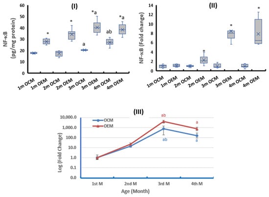 Ovarian expression of nuclear factor kappa-B (NF-κB) at (I) protein level and (II) mRNA level. (III) Age-dependent change in mRNA expression relative to the 1st month. OCM: offspring of control mothers, OEM: offspring of SOF-exposed mothers, m: month. n = 8 in each subgroup, data presented as median (IQR). *: OEM significantly differs from OCM by Mann–Whitney test (p ≤ 0.05). a: significantly different from 1st month by Kruskal–Wallis test (p ≤ 0.05). b: significantly different from 2nd month by Kruskal–Wallis test (p ≤ 0.05).