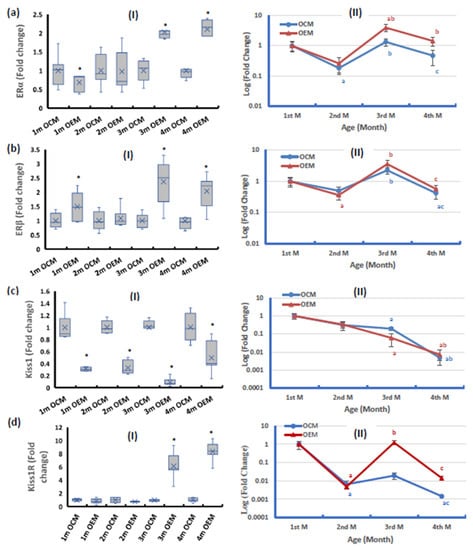 Ovarian expression of (a) estrogen receptor alpha (ERα), (b) estrogen receptor beta (ERβ), (c) Kiss1, and (d) Kiss1 receptor (Kiss1R) at (I) mRNA level. (II) Age-dependent change in mRNA expression relative to the 1st month. OCM: offspring of control mothers, OEM: offspring of SOF-exposed mothers, m: month. n = 8 in each subgroup, data presented as median (IQR). *: OEM significantly differs from OCM by Mann–Whitney test (p ≤ 0.05). a: significantly differ from 1st month by Kruskal–Wallis test (p ≤ 0.05). b: significantly differ from 2nd month by Kruskal–Wallis test (p ≤ 0.05). c: significantly differ from 3rd month by Kruskal–Wallis test (p ≤ 0.05).