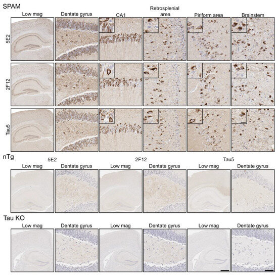 - Xia, Y.; Prokop, S.; Bell, B.M.; Gorion, K.M.M.; Croft, C.L.; Nasif, L.; Xu, G.; Riffe, C.J.; Manaois, A.N.; Strang, K.H.; et al. Pathogenic Tau Recruits Wild-Type Tau into Brain Inclusions and Induces Gut Degeneration in Transgenic SPAM Mice. Commun. Biol. 2022, 5, 446–464. [Google Scholar] [CrossRef] [PubMed]