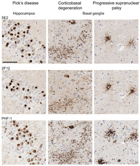 - Gibbons, G.S.; Banks, R.A.; Kim, B.; Changolkar, L.; Riddle, D.M.; Leight, S.N.; Irwin, D.J.; Trojanowski, J.Q.; Lee, V.M.Y. Detection of Alzheimer Disease (AD)-Specific Tau Pathology in AD and NonAD Tauopathies by Immunohistochemistry With Novel Conformation-Selective Tau Antibodies. J. Neuropathol. Exp. Neurol. 2018, 77, 216–228. [Google Scholar] [CrossRef]
