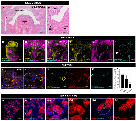 Salivary glands develop within the primitive oral epithelium, invaginating the mesenchyme. Primordia of the three major salivary glands, SMG, SLG, and PG, were identified in the coronal section of fetal heads of embryonic day 12.0 (E12.0) mice (Figure 1A,B). Figure 1C–H depicts fluorescent protein expression in the salivary glands of E13.5 TRiCK mouse embryos. TRiCK mice have a three-color fluorescent protein-coding gene cassette, where Venus indicates Sox1-positive cell-derived tissue, mCherry indicates T/Brachyury-positive cell-derived tissue, and mCerulean indicates Sox17-positive cell-derived tissue. Three-dimensional (3D) images of the embryonic mice were captured as transparent whole-body pictures using a light sheet microscope (Figure 1C, Video S1 and S2). The three colors labeled Venus, mCherry, and mCerulean exhibited no overlapping fluorescence signals. Furthermore, the axial section in the Z-series images of the E13.0 embryo appears to reveal a large number of Venus-positive cells were present in the prospective SMG and SLG (Figure 1D). In contrast, mCherry was primarily expressed in the mesenchyme. Most of the cells were mCerulean-negative, but a very few positive cells were present (Figure 1E–H). The expression of each fluorescent protein (FP) was confirmed in adult mice using frozen sections of SMG from postnatal day 50 (P50) TRiCK mice. These three colors were also observed in adult SMG tissues (Figure 1I–M). Morphological analysis revealed more intense fluorescence around the ducts. The expression of all three FPs in both fetal and adult tissues suggests that the SMG comprises tissues originating from each of the three germ layers. Primordia of the SLG and PG, which are major salivary glands other than the SMG, exhibited thickening of the oral epithelium with a similar expression pattern of the FPs to that observed in the SMG (Figure S1). The area percentages of each fluorescence-positive tissue in adult salivary gland tissue show that Venus-positive cells are the largest area with the analysis of Image J (Figure 1N). Since Keratin 14 (Krt14) has long been considered a biochemical marker of the surface ectoderm that develops the epidermis, we further examined the distribution of Krt14-driven cells in the salivary gland epithelium using Krt14-cre mice [21,22,23]. tdTomato-labeled Krt14-driven cells were widely distributed in the SMG and SLG glandular epithelia (Figure 1O,P), while several epithelial cells did not express tdTomato (Figure 1Q,R).