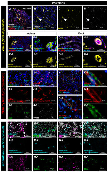 Immunofluorescence was performed to know the property of Sox17-expressing cell-derived tissues. Co-staining with antibody against E-cadherin (E-cad), an epithelial adhesion marker, confirmed that Sox17-expressing cell-derived tissues, mCerulean-positive cells did not form the epithelium (Figure 2L). Furthermore, co-staining with antibody against TUBB3, CD31, and SMA showed mCerulean-positive cells did not express these three proteins. Thus, mCerulean-positive cells did not form epithelial cells, nerves, blood vessels, or myoepithelium (Figure 2L–O). These results showed that there were a few mCerulean-positive cells in the mesenchyme and those Sox17-expressing cell-derived tissues differentiated into mesenchymal tissues other than nerve, myoepithelium, or blood vessels in the adult SMG. There is a possibility that the Sox17-expressing cell-derived tissues may be related to incomplete recombination by Sox17-driven phiC31o, as reported previously [13].